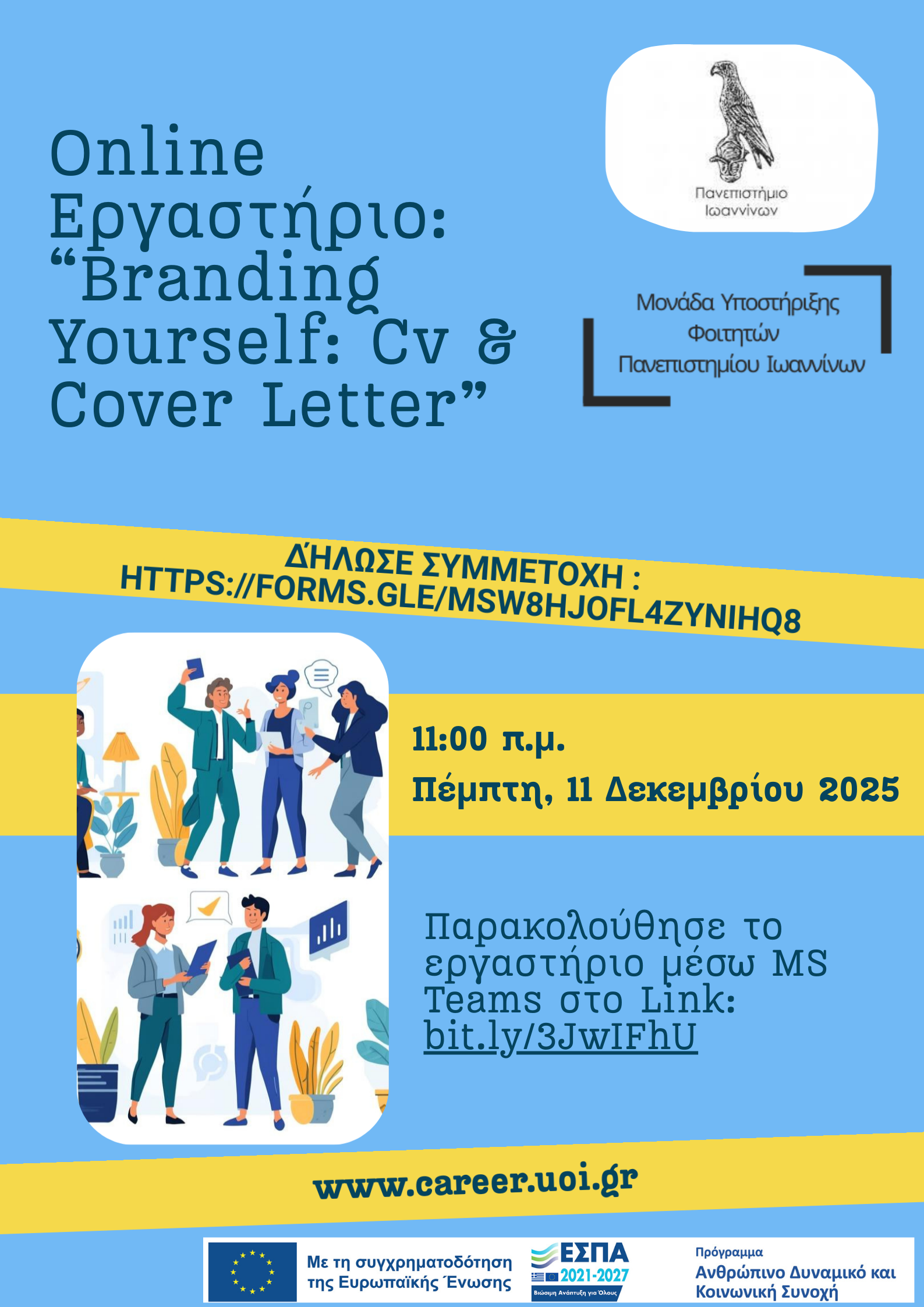 Η Μονάδα Υποστήριξης Φοιτητών του Πανεπιστημίου Ιωαννίνων διοργανώνει την Πέμπτη 11 Δεκεμβρίου 2025, ώρα 11:00 π.μ. ένα πρακτικό και διαδραστικό online εργαστήριομε τίτλο “Branding Yourself: CV & Cover Letter” με στόχο να βοηθήσει τους/τις φοιτητές/τριες να δημιουργήσουν ένα δυνατό και επαγγελματικό βιογραφικό σημείωμα, καθώς και να αναπτύξουν την προσωπική τους επαγγελματική ταυτότητα.